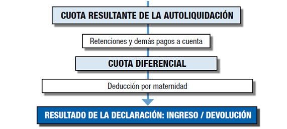 La última parte antes de conocer el resultado de la Declaración de la Renta Autónomos. Es el resultado de aplicar a la cuota líquida o de autoliquidación las retenciones y demás pagos a cuenta aplicados en el periodo. Una vez hallada la cuota diferencial para obtener el resultado de la declaración solo habrá que aplicar la deducción por maternidad en el caso que corresponda.