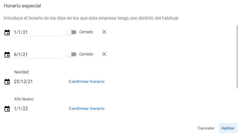 Lo ideal es que ante cualquier alteración del servicio, puedas modificarlo. Así los usuarios pueden consultar antes de acudir a tu establecimiento o local si estáis abiertos. Para hacerlo solo debes entrar en el emoji del calendario 📅 e introducir qué días permanecerá cerrado (o abierto) el local.