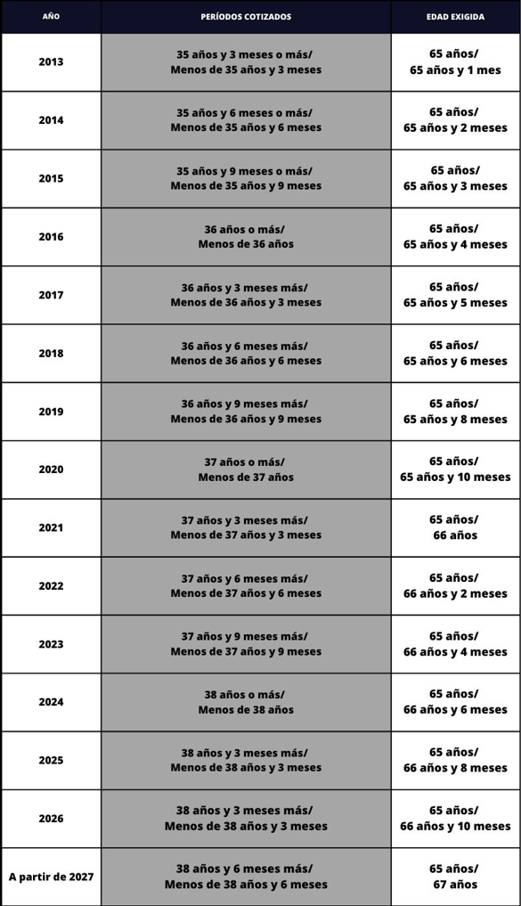 La edad legal de jubilación en España se está ampliando cada año desde 2013 hasta llegar progresivamente a los 67 años en 2027 o a los 65 años siempre que se acrediten 38 años y 6 meses o más cotizados.