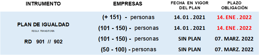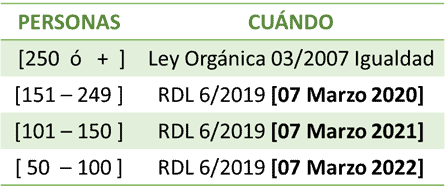 En las siguientes imágenes podrás comprobar qué empresas se ven afectadas en la implantación del Plan de Igualdad, su regla transitoria y cronología de afectación.