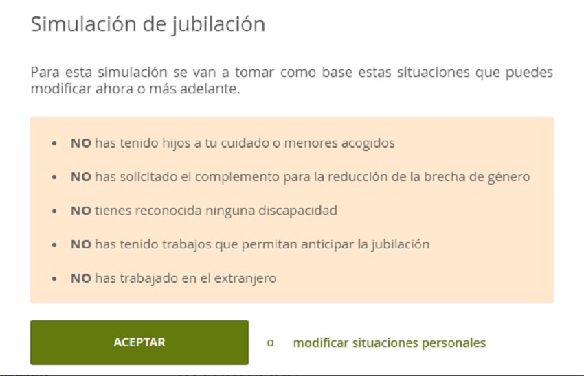 👨🏫 Al pulsar en “simular tu jubilación” aparecerá una pestaña emergente en la que te indica que se han obtenido los cálculos sin tener en cuenta algunas situaciones. Podrás cambiarlas en “modificar situaciones personales”.